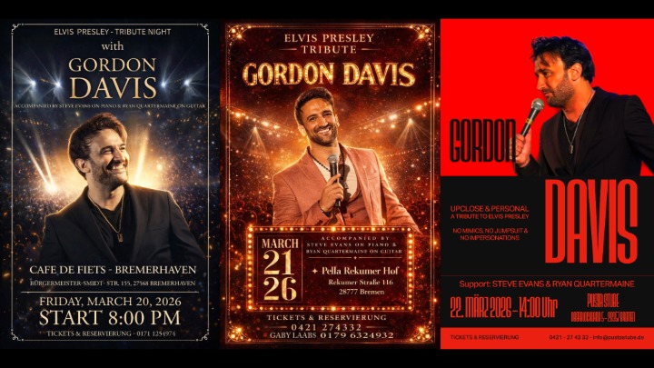 Musikliebhaber und Elvis-Fans dürfen sich auf ein besonderes Highlight freuen: Das bevorstehende Konzertwochenende mit Gordon Davis verspricht ein unvergessliches Erlebnis voller Energie, Nostalgie und musikalischer Leidenschaft. Unterstützt wird Davis von Steve ‚on Keys‘ Evans am Keyboard und Ryan Quartermaine an der Akustikgitarre, die gemeinsam für ein außergewöhnliches Live-Erlebnis sorgen.